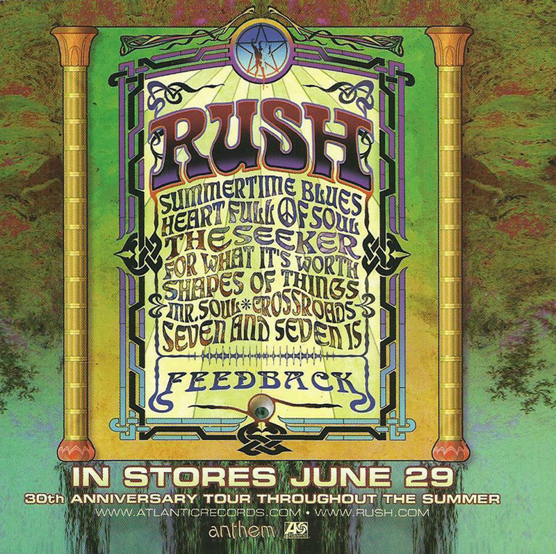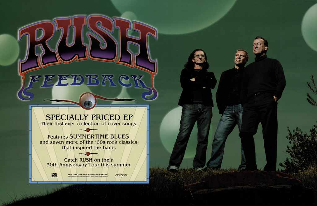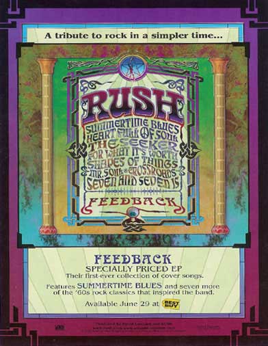 "Anthem/Atlantic recording group Rush has unveiled details of their upcoming new collection, dubbed Feedback. This unique set sees the renowned trio - Geddy Lee, Alex Lifeson, and Neil Peart - celebrating the band's 30th anniversary by performing cover versions of eight rock classics from the Sixties. Feedback is slated to arrive in stores on June 29... Feedback marks the first time that Rush has recorded songs by other artists and writers. Included are such groundbreaking staples as Buffalo Springfield's 'For What It's Worth' and 'Mr. Soul,' the Yardbirds' 'Heart Full of Soul' and 'Shapes of Things,' and the Who's 'The Seeker.' Feedback also features versions of two songs which defined the heavy rock power trio tradition that gave birth to Rush - Cream's explosive take on Robert Johnson's 'Crossroads' and Blue Cheer's still-extreme rendition of Eddie Cochran's 'Summertime Blues.'..." - Feedback Press Release, Rush.com, May 14, 2004