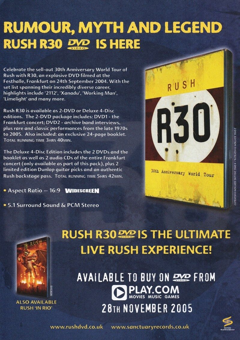 "Rio was all about being in that 12th row center seat and feeling the energy of the crowd, whereas R30 is more about the performers and the production. It's a tighter sound - a tighter mix with less ambience and less crowd...this is probably the best-sounding live performance of us I've ever heard." - Alex Lifeson, Sound & Vision, February 2006 issue
