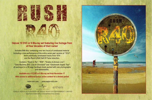 "2014 marks the 40th anniversary of the release of Rush's eponymous debut album in 1974. This superb collector's box set brings together live performances by Rush from each decade of their career. It includes 'Rush In Rio', 'R30', 'Snakes & Arrows Live', 'Time Machine 2011: Live In Cleveland' and 'Clockwork Angels Tour' plus a bonus disc of previously unseen live material stretching from 1974 to 2013. Rush are renowned for the energy and excitement of their live concerts and this set brings together some of their finest performances. The 6 Blu-ray discs are contained in a stunning 56 page hardback book measuring 305mm x 225mm with the 6 discs contained in 5 additional rigid insert pages. The 56 pages of the book are filled with memorabilia and photographs documenting 40 years of Rush live in concert. This is the ultimate collection of Rush live performances, beautifully presented." - R40 Press Release