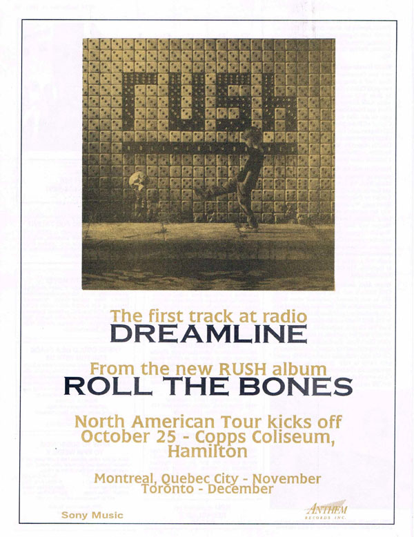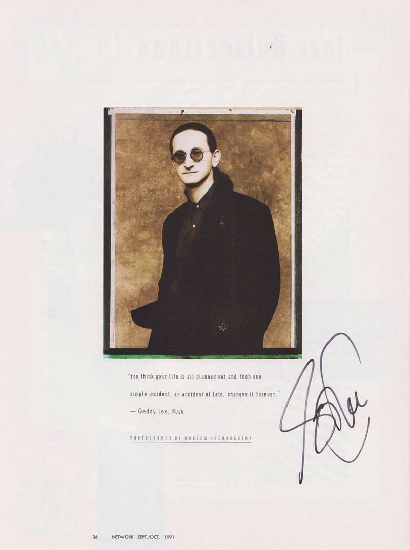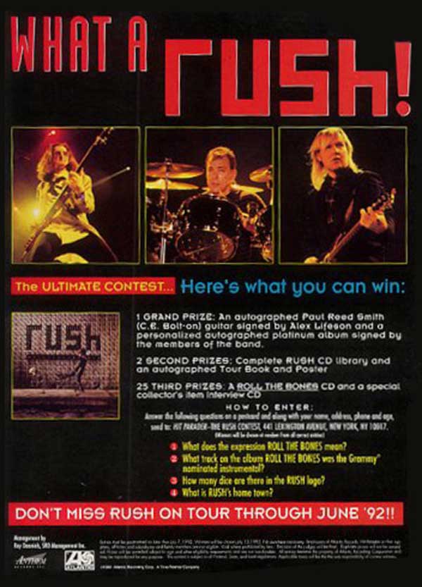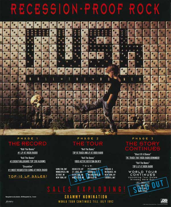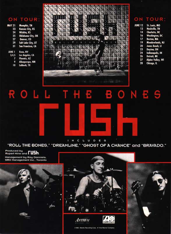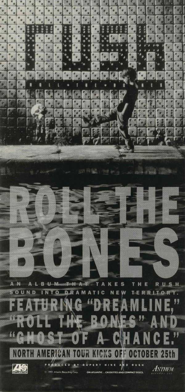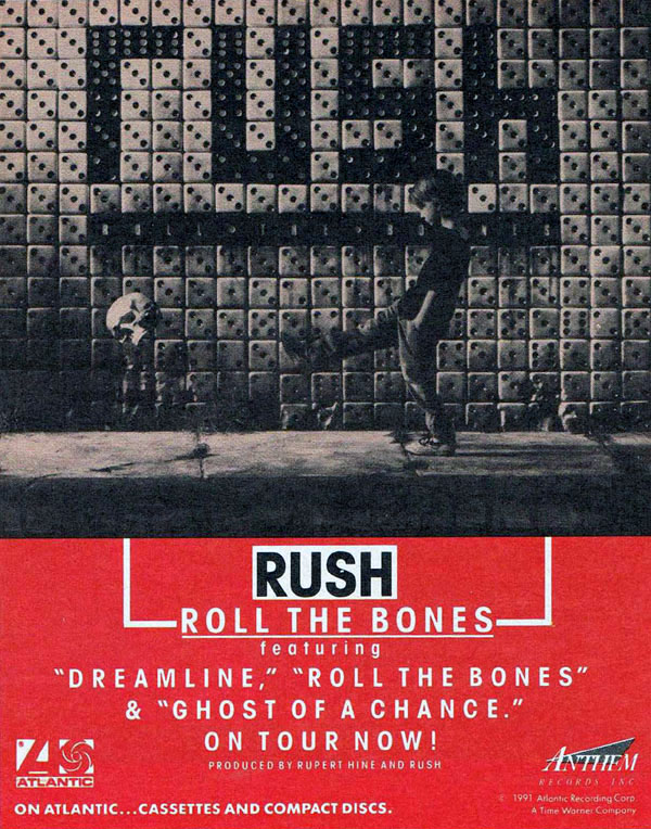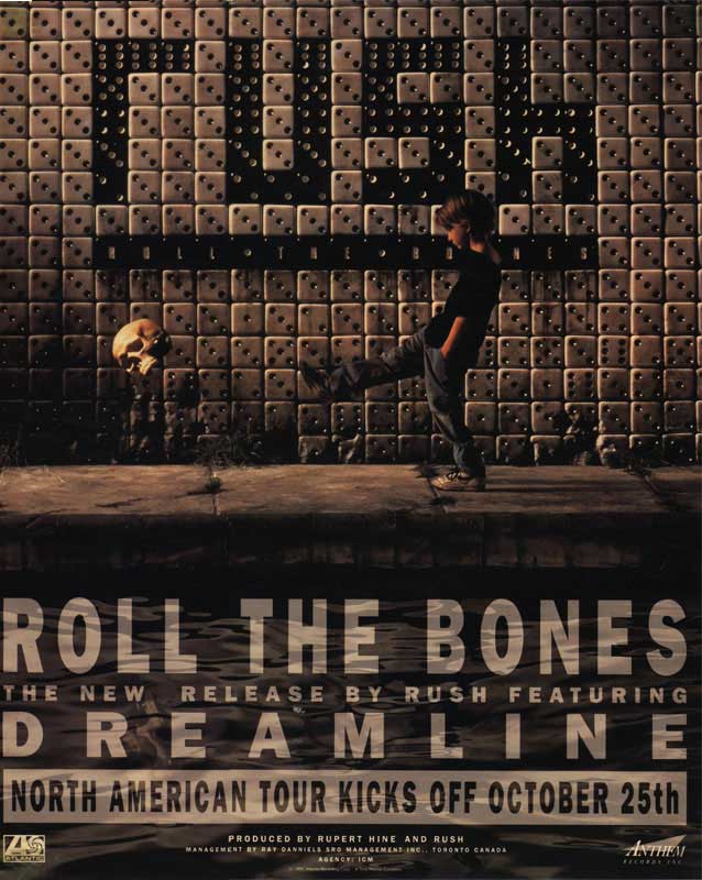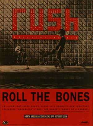 "Rush's new album, Roll The Bones, revolves around Peart's notion of chance. He recalls sitting in his cottage in the Laurentians with his notes from the past few years gathered around him when he suddenly realized how fate had couched the group 's enormous career. 'Chance is a very serious thing,' he says. 'I mean, we've accomplished a lot of this through discipline and hard work, yet at the same time our endurance has to be directly related to good luck -to successfully rolling the bones. That day in my cottage, I found myself asking very important questions: 'Why has there been this perfect chemistry among band members? Why has our success not jaded us? Why am I here?' I realized that there are no answers. The key, however, is in not asking what we can't do about it - fate and chance - but what we can do about it.'" - Network, February/March 1992