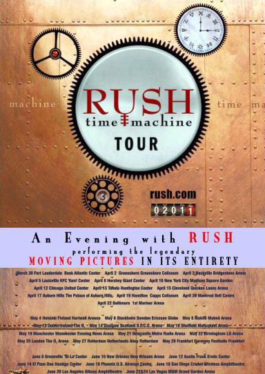 "Everybody was kind of itching to get on the road and try and get in 'peak playing form' before we recorded the bulk of the record [Clockwork Angels], just to see what that effect is. In a way, we have this tendency to take a long period of time off, and then we kind of get our chops together and then go record. We thought it's kind of ass-backwards really, because when you finish a long tour, you're in such amazing playing shape that really, that's the time you should go in and start laying down tracks. But of course, you're exhausted by then, so we're trying to figure out if there's another way of attacking it. We thought it would be fun to put together a tour that was sort of 'future/past,' because those are some of the themes that are floating around the lyrical content and visual content that we're using for these new songs. So we thought, "Let's go out and do this Time Machine tour, where we can go mine our past, and at the same time, point to the future, try some new songs, and get us in shape......I think it's going to be an interesting challenge to play some of those songs, especially 'The Camera Eye,' a song we haven't played in years and years. Obviously, we'll probably do a slightly newer take on it. You never know what effect bringing older songs back has on you. There are times in the past that we thought, "There is no way we can make this song work," and then you get into rehearsal, you start playing it, and you're really pleasantly surprised how much you're enjoying it. And sometimes it takes on a whole new life.I think we've stopped being kind of cynical about our past in a way, and sometimes having a second look at an older song gives it a whole new story." - Geddy Lee, RollingStone.com, April 21, 2010