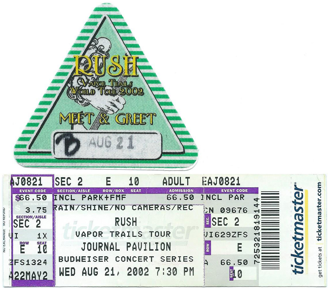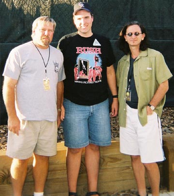 We walked up to the Will Call window to ask for our Meet and Greet passes, which had been secretly arranged for me by my wife as a 10th Anniversary gift. I had been told not to be late as the doors opened at 6:00, and the Meet and Greet would begin shortly afterwards. The employees at the ticket window new nothing about Meet and Greets, however, and said to check back later! After asking many times, the ticket manager finally sent someone to the backstage area to talk to a band rep about M&G passes. We really started to freak out at this point, thinking we weren't going to make it in, or that the band had cancelled the M&G. Finally at about 6 o'clock, we had our passes, and many sighs of relief were heard. We were eventually led back stage to where the semi trailers were lined up, and waited for the boys to come out. I was really calm until this point, but I was definitely shaken when Geddy and Alex walked out and greeted us. The M&G process was fairly quick, as each group was shuffled in and out after only saying a few words with Ged and Al.