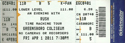 "Live Nation announced today that due to unforeseen circumstances the Rush performance previously scheduled for this Friday, April 1st in Greensboro has been postponed one day and will now take place on Saturday, April 2nd at the Greensboro Coliseum. Doors remain 6:30 pm with show time at 7:30 pm. After much consideration, as the Toledo performance would have been the 4th show in 5 days the decision was made to delay the show rather than move forward as previously scheduled. The added time between shows will ensure that fans in Toledo are treated to the best performance that Rush can deliver. As a result, the Toledo performance previously scheduled for Wednesday, April 6th will be postponed one week and will now take place on Wednesday, April 13th at Huntington Center. Tickets for both of the previously scheduled performance will be honored at the rescheduled dates. Fans requiring a refund may do so at point of purchase" - Rush.com, March 28, 2011