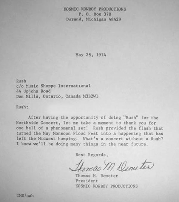 "I was at the North Side Drive In Rush concert of 18 May 1974. I was actually doing a black and white video recording of the event for the local (MSU) cable station. Unfortunately I doubt any of the tape of that event still exists. I vividly remember lying on my back, with a video camera, shooting up past the guitar into what I assume was Geddy Lee's face. Being a somewhat pedantic fellow I just thought that I would make one definite correction and a comment. The tour date listing has Dr. John on the bill for that show, in fact Dr. John did not show up (making for a rather ugly crowd at times) and the New York Dolls were the replacement act, not exactly an act the Lansing crowd 'got'. Secondly, I think I remember the announcer saying that this was the first time the band had been out of Canada...I was 16 at the time..." - Mark K Mondol via email April 2009