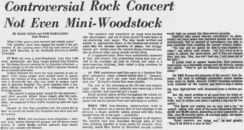 "The first gig Ray was able to get in the States for the band was a non-event pop festival in East Lansing, Michigan during the early spring. This outdoor festival was not Woodstock. Only 1,300 people showed up on a rainy day at the concert site.... a drive-in movie theatre. The audience was not familiar with the band's material and they received an indifferent reception." - Visions