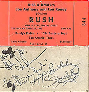 "Every time we played in San Antonio, I was reminded of the first time, in 1975. The show, at a country-and-western club called Randy's Rodeo, was being promoted by a small local radio station, and as we arrived in town, we were amazed to hear them playing nothing but Rush songs (we only had two albums at the time, so there wasn't much variety) all day and night...with all that radio hype, the tiny roadhouse was packed (meaning a couple of hundred people), and that performance was the seed of an enduring popularity for the band in San Antonio." - Neil Peart, Roadshow