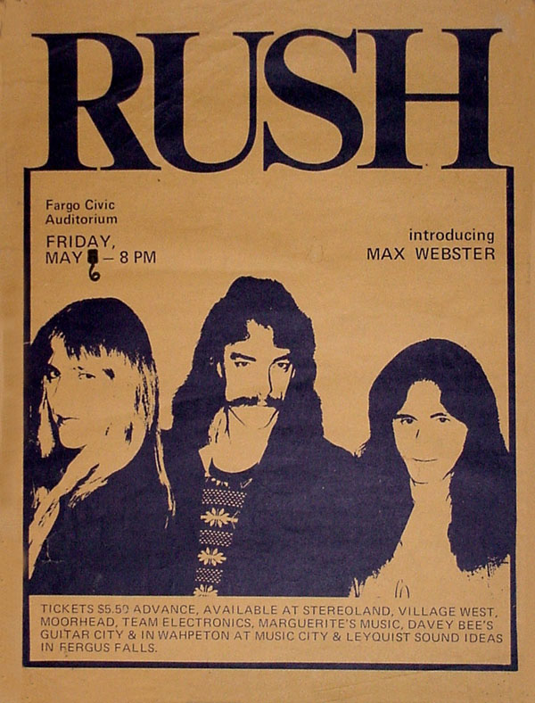 The correct day and date of this show is THURSDAY, May 5, 1977. The poster is erroneously printed as "Friday May 5", and some time in the past the date was marked through and changed by hand from a 5 to a 6. Whoever marked the poster with a 6 was in error, however, as on Friday May 6, 1977, Rush was playing one state over in St. Paul, Minnesota (promo materials from that date also featured the same photograph as this Fargo poster). In actuality, the poster was misprinted with the wrong DAY, but the correct DATE. In other words, the poster should have read "Thursday May 5".