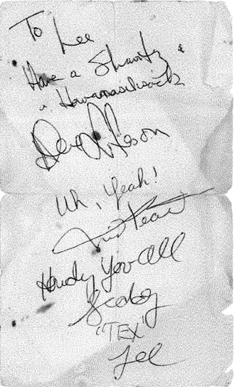"I bought the first Rush album in 1974 after hearing 'Working Man' on WRAS GA STATE UNIV radio. I am sure I am the first Rush 'fan' in Georgia and fanatically defended them thru 'Fly By Night' and 'Caress of Steel'. Anyway, on October 31 (Halloween) 1977, I saw them for the first time at Alex Cooley's Electric Ballroom in Atlanta, across from the Fox theatre on Peachtree Street, and slithered downstairs after the show and got an autograph. I always felt that Geddy Lee disliked the south and heard him make a disparaging remark onstage during the show. When I got my autographs from the band, Alex signed something that was supposed to be funny but no one has yet to understand what it means. After he signed, Neil wrote a small follow-up and Geddy signed his name Geddy "Tex" Lee (so much for his love of the south). If he only knew or cared how many times I had to defend his vocals, when the Bee-Gee's were hot. Maybe someone out there in cyberspace can tell what Alex wrote."