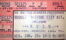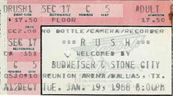 "I am 90% certain there was only one show in Dallas for that tour. I am 100% certain the show I went to got moved from it's originally scheduled date by a day or so. My ticket stub says the 19th but I think it got moved to the 20th. Unfortunately I can't remember the specifics. It was too long ago. If you look at the date in the lower left corner on the stubs you have you will see that the one for the 19th says A12DEC7 just like mine does. I seem to recall we got tickets on the day they went on sale. The one you have for the 20th says 15JAN8. Presumably it was printed after the date was moved (5 days prior to the show). In addition, having 2 shows in Dallas means they did 5 straight days without a break. No where else during that tour did they do that. (Except possibly February 21-26, which I think might be another mistake.)" - Roast Guider via email, May 20, 2012