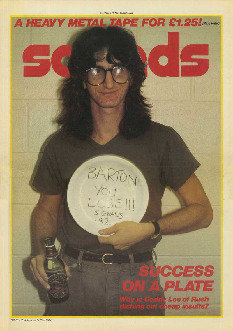 *AN EXPLANATION is in order, we feel, for the lack of connection between this week's Sounds front cover and the Rush feature within. This is due to what we in the trade lovingly refer to as 'another Makowski f*** up'. See, despite having had about a month to write the thing, our Pete failed to deliver his Rush piece in a readable form last week. With the dreaded deadline doom looking on the horizon, we had a colour front cover already on the presses at the printers but nothing to go with it! In the end we were forced to go ahead with this, a reprint of Neil Peart's Rush US tour programme notes, telling of the making of the band's latest album 'Signals'. Lucid and revealing they may well be, but they don't explain why Geddy Lee wrote 'Barton You Lose' on a china plate, do they? We'll leave that to Pete Makowski to explain in the real Rush feature, which he's promised to deliver to us next week. Or the week after...