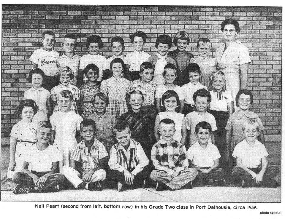 Caption: "Neil Peart (second from left, bottom row) in his Grade Two class in Port Dalhousie, circa 1959."