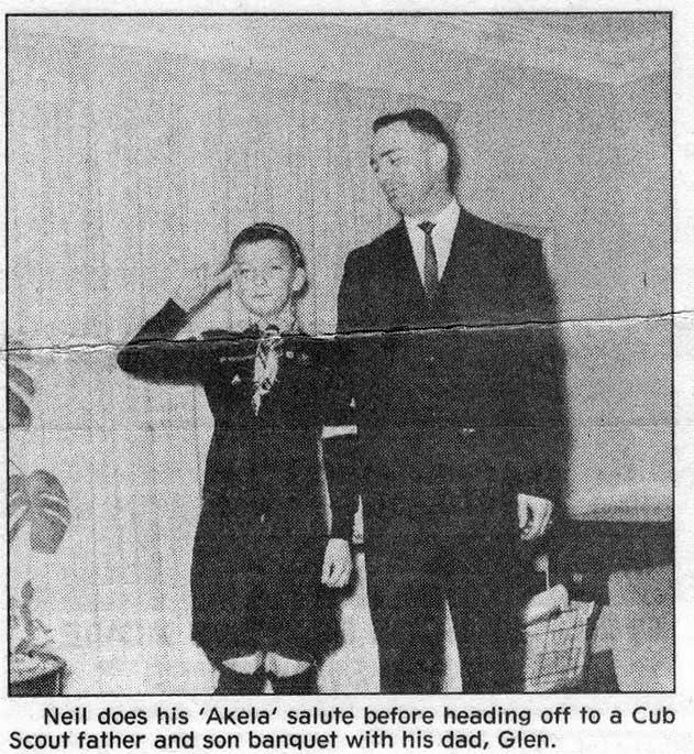 Caption: "Neil does his 'Akela' salute before heading off to a Cub Scout father and son banquet with his dad, Glen."