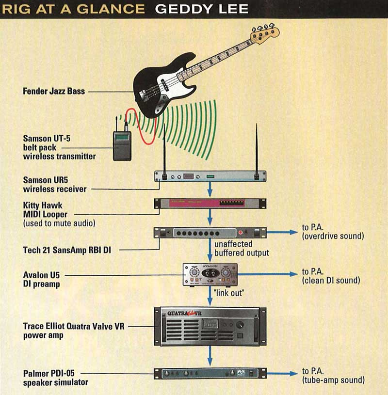 Whichever bass he's using, his signal goes through a Samson wireless setup and then to the house through feeds from three sources: a Tech 21 SansAmp RBI for overdriven sound, and Avalon U5 SI for clean DI sound, and a Palmer PDI-05 speaker simulator. The Palmer is driven by a Trace Elliat Quatra Valve power amp far a tubeamp tone.