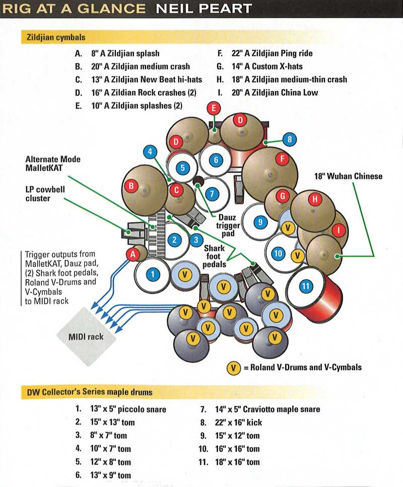 The drum set that Neil Peart is taking on this summer's tour is actually like two kits in one. Situated on a rotating riser, the front part of the kit is a DW custom red-sparkle finish acoustic set featuring a kick, two snares, and eight toms, all outfitted with Remo whitecoated Ambassador heads. The acoustic kit also features numerous Zildjian cymbals, including two sets of hi-hats, a ride, three splashes, four crashes, and two chinas.