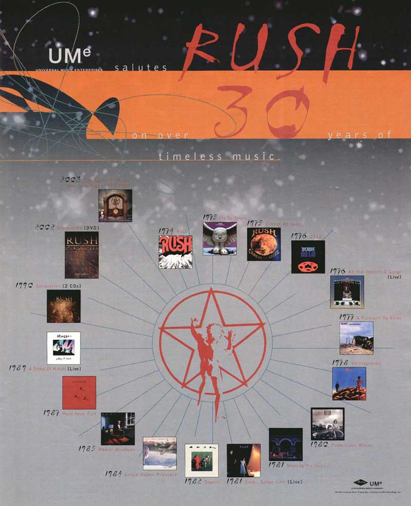 "Rush are very uniquely defined musically and in the marketplace," he says. "They wouldn't have a 30-year career if that weren't the case. They might have sold more records in a shorter time span, but they wouldn't be around today and be able to make money on the road like they do and still have a fan base.