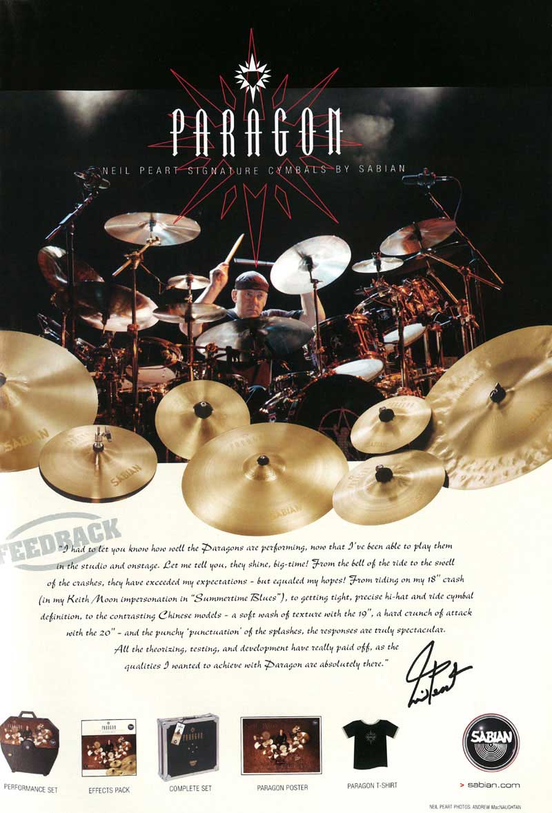 "This year for me has been a tremendous example of that, what with working with Sabian in designing the Paragon cymbals," he says with all the childlike glee of a youngster that's facing his first kit on a Christmas morning. "It was the same with the drum kit I'm using, the 30th anniversary set. I went to the DW factory every week for a couple of months to design the drum set - what it would be like sonically, what it would be like visually. I was able to go there every week and consult with their craftsmen and work on it at that organic level, so that was cool.