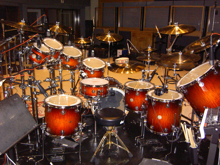 Well, yeah, obviously. So in talking to John Good at DW, we decided to build a pure "recording" kit, with basic chrome hardware and a natural wood finish. John designed an elaborate combination of laminates and reinforcement hoops for each individual shell, and Garrison, the company's "artists' rep," started organizing the hardware. I would ship down my own set of Paragon cymbals (properly worked-in after the R30 tour) and a few favorite snare drums, plus a set of the "drum boards" on which my kit is mounted, so the stands could be screwed right into it.