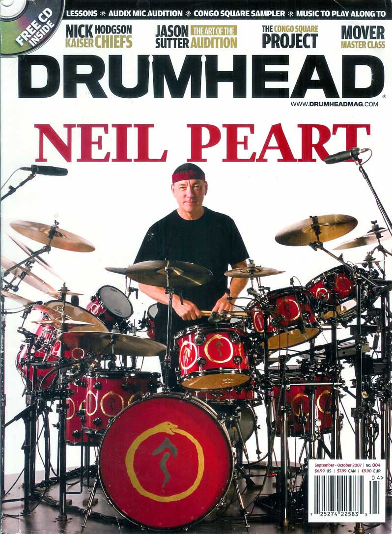 And sure enough, when we went to start working on the songs for Snakes And Arrows many of them were in 3. Suddenly I was using exactly all that stuff. In "The Way The Wind Blows" the tom bridges and the ride cymbal pattern through it, are exactly that pulse, that "Drum Also Waltzes" thing that I'd been doing for so long. So, having completed that circle as it were, it's really exciting now to find a new avenue, and then to only think afterwards how similar my 4/4 pattern is to the 3/4 pattern, and consequently I have a similar amount of facility and freedom with it. So, that's an example of the kind of the circle that's come around. I wanted to keep the 3/4 stuff too, 'cause I still love that lilt, so I put it into an ethnic section, as you'll hear when I run through it, and have keyboard percussion just playing long sustained chords while I go around tablas and a Zulu drum and a shaker and stuff. So I do the 3/4 "boom-shh-shh" with shaker, and then play samples on top of it. And an industrial thing, which I've never actually done. I'm bringing back techno, bringing back industrial sounds, 'cause it's something I never really used, so all of that became pieces of it, and I'm trying as hard as I can to make it improvisational. I talked so much on "Anatomy Of A Drum Solo" about being so choreographed and architectural about it, so I thought, "Well, I'm not going to do any of that anymore," alter having stated that as my whole nature of being, and my nature as a drummer too.