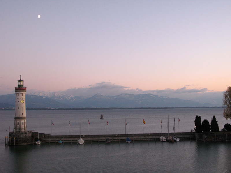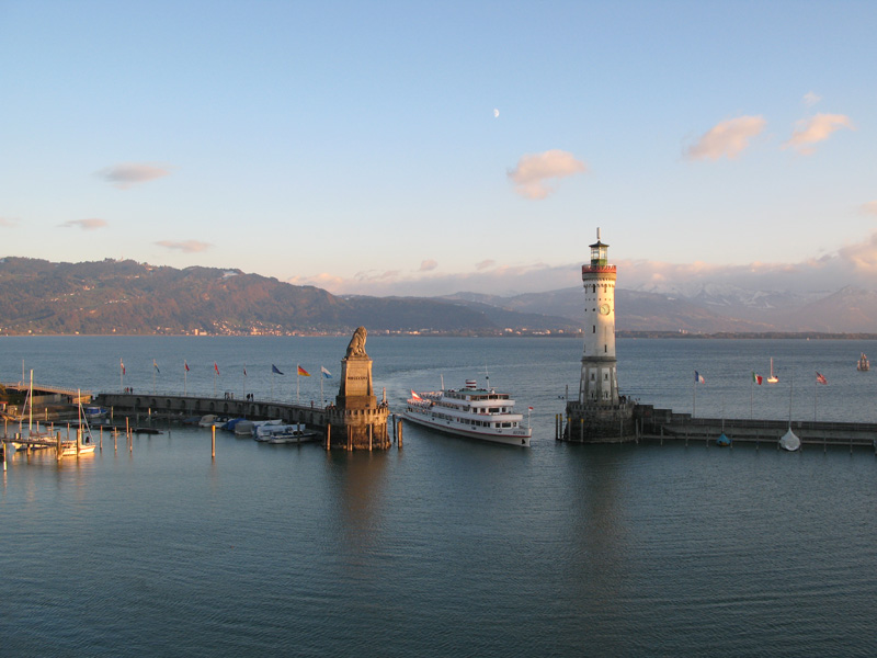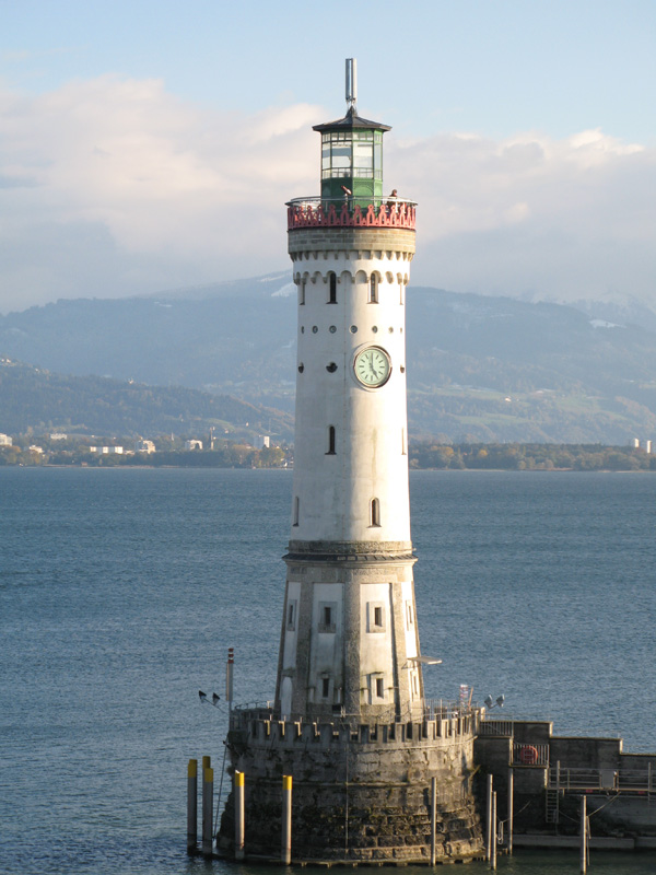 This lighthouse was the centerpiece of the view from the balcony of my room at the Hotel Bayerischer Hof (Bavarian Court) in the island-city of Lindau, Germany. On a large lake called the Bodensee, or Lake Constance, near the present-day borders of Germany, Austria, and Switzerland, Lindau's history dates to Roman times, growing from a monastery to a fortified city-state almost a thousand years ago. A fair-sized island - two-thirds of a square kilometer, or about 170 acres - today Lindau is connected to the mainland by a causeway, and the city retains a picturesque, medieval atmosphere.