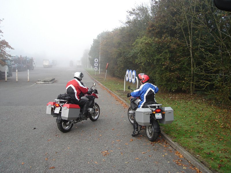 Setting off from the bus on a misty morning,in a British motorway services (photo taken by our bus driver, Mark, from his driver's seat) |