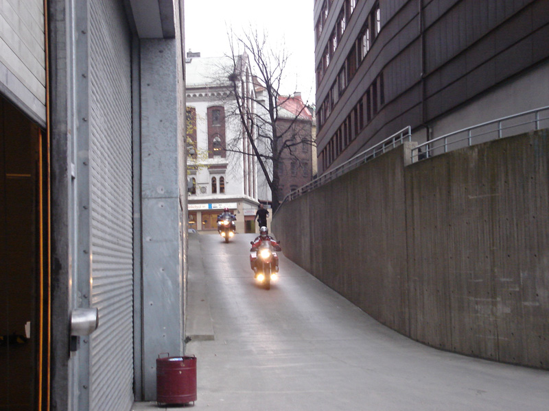 The Hour of Arriving 2 - Brutus follows me into the arena in Oslo, directed by Michael at the top of the ramp (photo by Mark) |