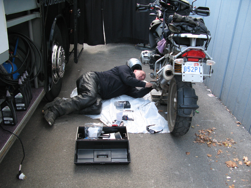 Before Brutus and I arrived, Michael had Mark park the bus close along a wall near the backstage entrance, then arranged to have some free-standing curtains from the building placed at each end of the bus, between it and the wall. When we rolled up, Kevin pointed me behind the bus and trailer, and pulled back the curtain at one end for me to ride through. Thus I had a private area to work on the bike, hidden from gawkers, rockers, talkers, and stalkers. (An audience is very good to have when you're performing, but not so much when you're lying on the ground changing your oil.)