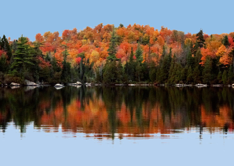 Autumn is said to be a season of nostalgia, "pain for a lost home," and in the following rainy days, lazing and reading by the fire, I was reminded of other autumns, especially in that same area. Back in the early '80s, my bandmates and I were recording at nearby Le Studio (working there had introduced me to the Laurentian region, where I have had a home for almost thirty years). The studio's guest house overlooked a small lake, with a steep wooded mountainside rising behind it, and that was the view from our breakfast table. On those brilliant October mornings, we noticed how the colors on that vast canvas of forest changed visibly from one day to the next - a new blaze of red, a flash of orange, a wash of yellow. One afternoon when the studio crew were busy with some technical job, Alex and Geddy and I rowed across the lake and climbed that mountainside, up to where I knew a ski trail crossed its high ridge.
