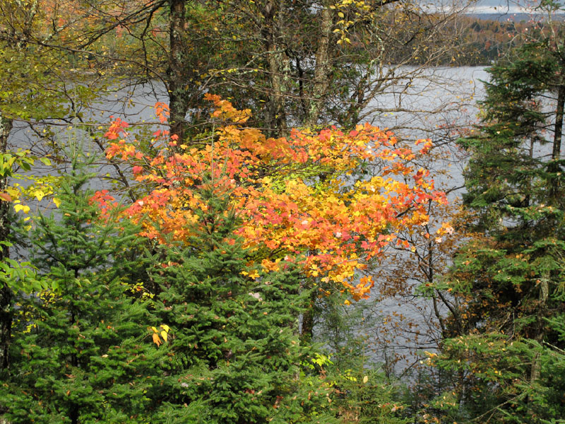 It has been quite a few years since I visited Quebec in autumn, and I was very excited about getting up there. I arrived on October 6, just at the "tail of the peak" for the fall colors, before wind and rain brought them down to carpet the forest floor, leaving the stark gray trunks and branches naked against the icy winds to come. The woods all around, and stretching away over the rounded hills behind the lake, were painted in brilliant reds, yellows, and oranges, all flaming among the dark green conifers. As I stood outside and looked around at the radiant beauty, the crisp air fragrant with woodsmoke from my own fireplace, in a silence complete but for the hushed murmur of the stream, I uttered an involuntary, "Oh my."