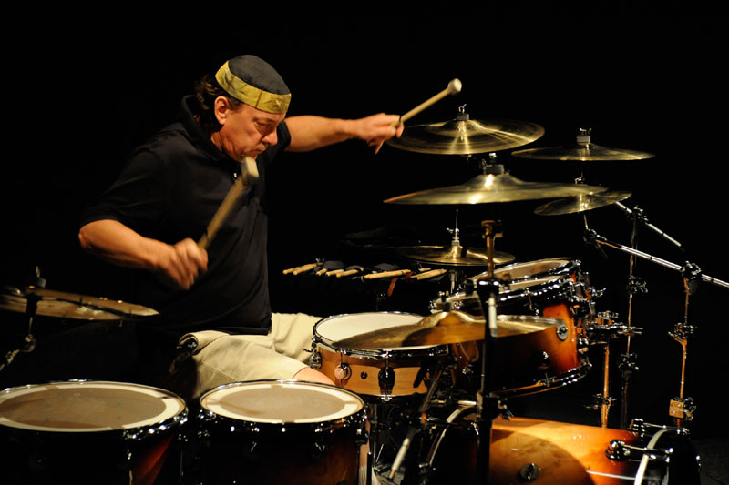 Another factor in recent years has been that I have spent so much time away from home playing the drums that when I did get back, it was kind of nice to step away completely from the "tools" for a while. If you have drumming in your very pulse, the flow of rhythm in your life is ceaseless, a constant kind of conceptual practicing. (Sitting at a red light, turn indicators set the tempo for an improvised cadenza on the steering wheel.) On the physical side, after forty-four years of playing the instrument, the language of drumming is wired deep in my brain and muscle fibers. So, as one does, I simply adapted to the way things were, and made a virtue of a necessity - "that's how it is, so okay" (a very grownup philosophy indeed). When I needed to rehearse for something, I found other ways - sometimes heading for Toronto a week or two early, or in recent years at the Drum Channel studio, a beautiful hour's drive north along the Pacific Coast Highway, if they had some downtime.