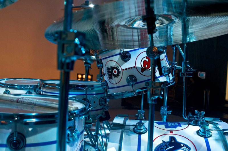 A tribute to Drum Workshop's artistry is that for over a year the R30 kit has been on display at the American Motorcycle Association's museum in Columbus, Ohio - along with the Ghost Rider bike - and was a centerpiece at the instrument maker's trade show, NAMM, then did a tour of drum clinics across the U.S. and Canada - just the drums, not me! Plus DW built thirty replicas (each costing an equal number of thousands of dollars), which found enthusiastic buyers. The Snakes and Arrows set was recently exhibited at the Percussive Arts Society's trade event in Indianapolis, and the Buddy Rich tribute kit was bought off the stage after that concert and is on permanent display at a drum store in Pennsylvania. We only jump ahead in the story a little to reveal that the "hockey drums" would be exhibited at NAMM in January 2010, and will soon be a major display at the Hockey Hall of Fame in Toronto.
