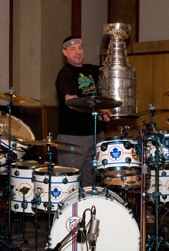 The Cup's traveling companion and attendant, Craig, allowed me to lift that treasured Canadian symbol (more than a hundred years old) out of its road case and hold it up high (it weighs thirty-five pounds), like I was a hockey player whose team had just won the Stanley Cup. The earliest inscription was inside the bowl, for a game in 1904, in which "The Kenora Wanderers Beat Ottawa." Every winning team since was engraved on silver bands around the sides (they add another circle when it gets too full). I stood behind my drums for the cameras, holding up that Cup, and thinking, "Take that, bullies from fifty years ago."