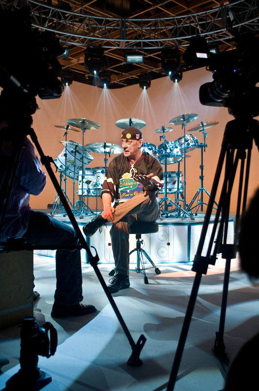 Then the drums had to be moved to the soundstage, and were broken down by Garrison, his partner in my West Coast Pit Crew, Chris from cymbal-makers Sabian, and some of the Drum Channel crew (I told Don later that it was wonderful to see him, the president, with his rain-wet hood over his head as he helped with the loadout).