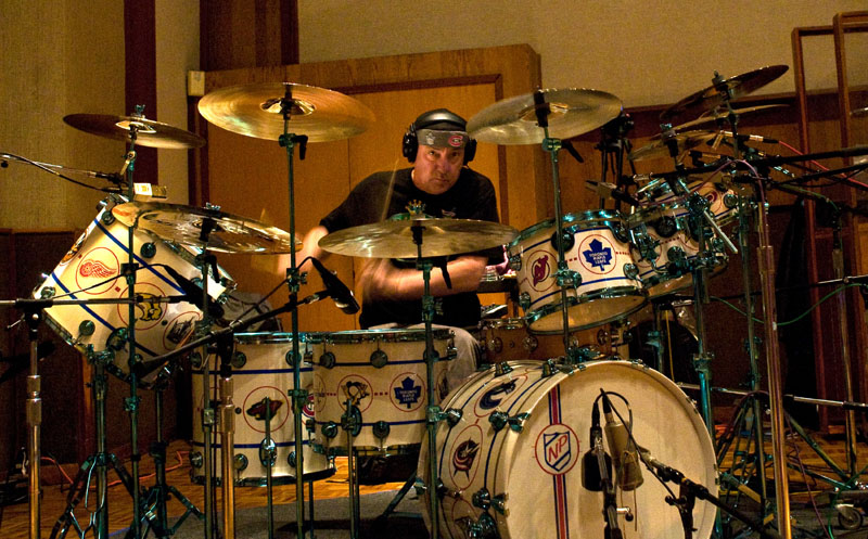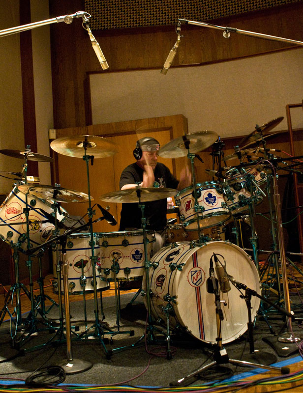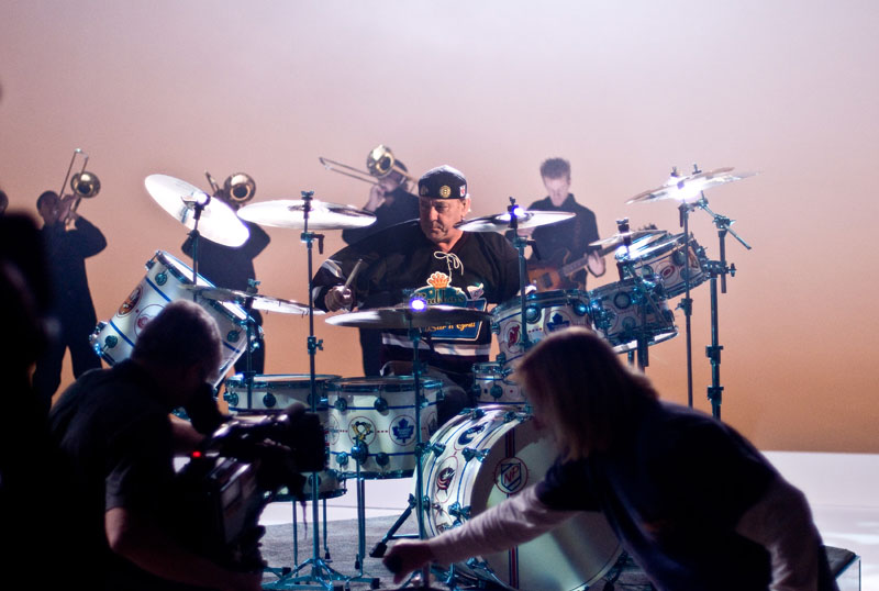 As I started working on my drum part, Andy (Vice President of Hockey Affairs) brought me a request from Eric, the director at TSN - he wanted me to record the performance first in a recording studio, then move to a soundstage (on the same day) and reproduce it for the cameras - without microphones all over the place, and with more control of lighting and camera angles. At first I was reluctant. You can't "lip-sync" drums, of course, as drumming is so physical that it's not "fakable." When you watch somebody try, and hear something completely different from what you're seeing, it's painfully, humorously obvious.