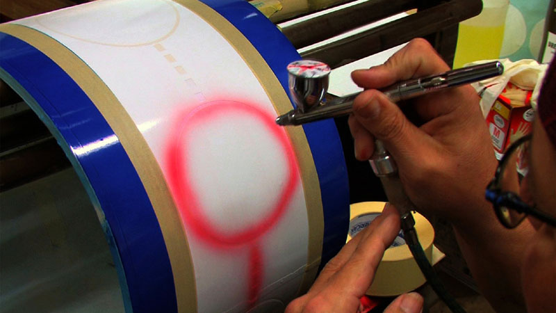 The date of that meeting was October 21, 2009, and the shoot was scheduled for early December, so there wasn't an abundance of time. John and I met in the DW boardroom with his shell-construction foreman, Shon, hardware specialist Rich, artists' rep (and invaluable member of my West Coast Pit Crew when my drum tech Lorne Wheaton isn't available) Garrison, and the company's great artist in drum finishes, Louie. Don and cameraman/editor Jose captured the scene for our "Making Of" documentary.