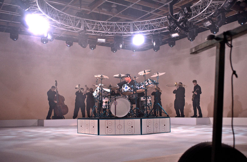 Don's crew filmed the first meeting between Matt and me, as we sat at the piano and discussed ideas for the arrangement, then played piano and drums (brushes) to explore different feels and tempos. The parameters were simple: I wanted to pay due respect to Dolores Claman's original composition, and the equally classic orchestration, to some degree, while making it more of a "solo drums" performance.