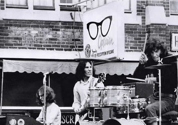 It was a summer Saturday in 1970, and I was playing with the band J. R. Flood in St. Catharines, Ontario. We were set up on the back of a flatbed trailer on James Street, closed to traffic for a Saturday "whoopee." The idea was for us to entertain the youngsters, confound the adults, and share a $250 fee. Pictured are the late organist Bob Morrison and guitarist Paul Dickinson, and we had bass guitarist Wally Tomczuk and singer Gary Luciani. I was seventeen.
