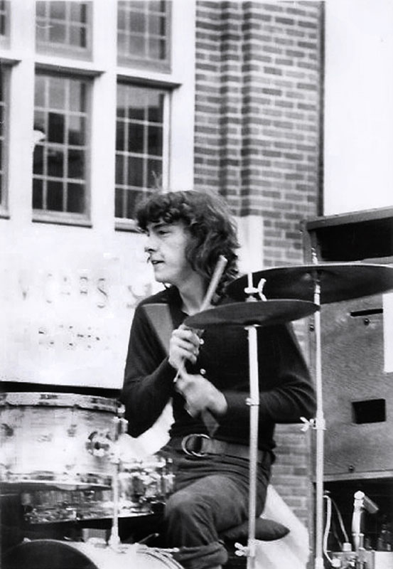 My pantlegs are rolled up like a clown to prevent the bass-drum-pedal beaters from fouling in my flares (I use a bicycle clip these days), and the drumsticks are played backwards, "butt-end," because I couldn't afford to replace broken ones, so turned them around and used the other end. I'm sitting on a little square pillow ("liberated" from my mom) atop an upturned metal barrel (in which my dad's farm equipment dealership sold calcium carbide for bird-scarers - sigh, so much needs to be explained when you're telling about a time machine: those bird-scaring devices looked like a long megaphone atop a box, and they made a loud explosive noise from time to time, to scare birds out of orchards and vineyards). That steel barrel also served as a hardware case, because after the gig I could fill it with the stands and hardware.