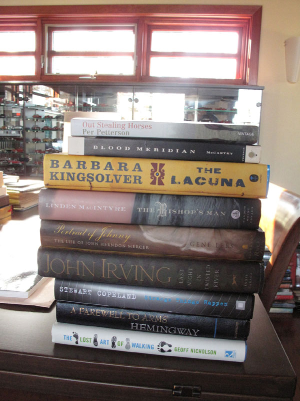 This pile of volumes represents my reading list for ten days in late February, a solitary winter retreat that was somewhat marred by bad weather, and being under the weather, so I had nothing better to do than lie by the fire and turn the pages. (If there really is a heaven ... )