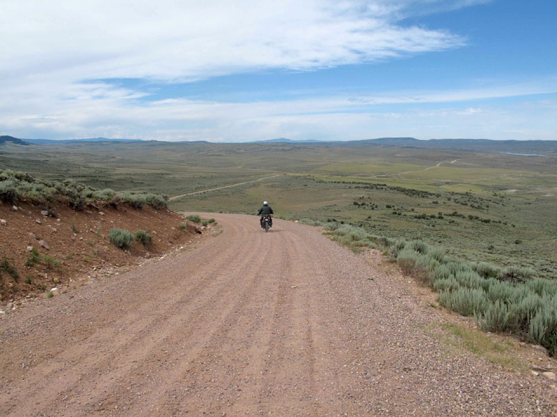 Always preferring to start a story (or a day) with the "good news first," this photograph illustrates the pleasant ride that began this second leg of the Time Machine tour. It was August 5, 2010, in western Wyoming, on the way to a show in Salt Lake City. The gravel road lay like a brown ribbon over the rumpled blue-green sagelands, tracing away toward the upper right of the photo. Ahead of us, the mountains of Utah begin to rise in the distant west.