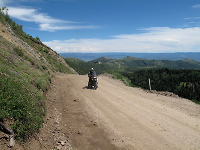 Shortly after that little existential reckoning (and you can bet I was "reckoning" on that near-death experience for some time after - still am), I followed my GPS unit, Dingus, onto an unpaved road near the frontier outpost of Idaho City. I had mapped a road like that into my route, but that plan was for two riders, and once again, I felt nervous being alone in such a remote and risk-filled environment. Then the road began to deteriorate and dwindle to a pair of rutted tracks, bumping up and down and forking off here and there into little logging trails. Dingus couldn't decide whether we were actually on the right road or not - the purple line that represented my route kept separating itself suspiciously from the little motorcycle icon that was supposed to be me.
