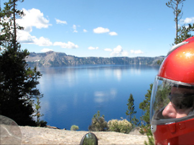 Michael and I met up that night in Conner, and next day had an enjoyable ride across Eastern Washington's irrigated hayfields and hops farms (apparently a prestigious and tightly-regulated crop, we had once been told by a local policeman who had stopped us for a speed infraction, but was friendly and "forgiving"), and over the Cascades (and into rain, predictably). After the Seattle show, we rode the bus down to Roseburg, Oregon, where we were met in the morning by Greg Russell on his Halloween-colored KTM. He would join us for the ride to the next show in the Bay Area - by way of Crater Lake National Park, Lassen Volcanic National Park, and some remote and adventurous back roads in Central California.