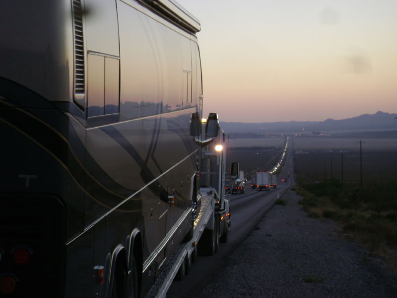 (Don't you have to wonder about all those headlights driving away from Vegas that early on a Saturday morning?) Dave's drive was over, but his day was not. Not only did he have to make sure the bus arrived at the shop, and that somebody was actually working on it (they weren't), but at the previous show I had asked Dave to set me up for an oil change in Vegas (for that routine, before my arrival Dave lays out the tools, oil, filter, drain pan, and a rug for me to lie on while I work, and I just roll up and get the job done, while the oil is still hot and holding any contaminants in suspension). Under the circumstances of that day, I certainly would have understood if that "sideline" operation got overlooked. But no - when Michael and I rode up beside the MGM Grand Arena (in 112° heat), Dave had the oil-change setup all ready. Champion's points for that.