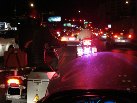 Riding my own motorcycle out of the MGM Grand Arena that night after the show was certainly a novel experience (unique, even, as I have never actually left a show by motorcycle), and I confess that I was mildly thrilled at having our two motorcycles led by two police bikes, with flashing lights and everything (nice to have them in front of me, for once, instead of behind).