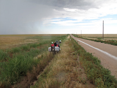 So I was riding along through that big open country and feeling good. (Though our run of bad luck hadn't run out - in Denver, Michael had discovered a flat rear tire on his bike as well, and had it replaced.) The wide blue dome of the Great Plains sky above us was blotted by a few distant dark clouds and gray veils of rain, but right around us we endured the same hot, dry weather we had been suffering for many days - reaching 105° that day. So if anything, I was thinking a brief rain shower might cool us off a little, and Michael hoped it might lay the dust somewhat - because he was riding behind me (though I had courteously moved to leeward on the road when I could, so the dust was blown away from him).