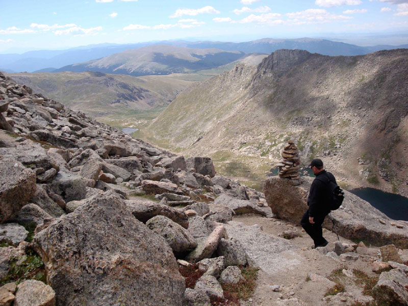 I felt that same sense of relief - reprieve - on this occasion, on the day off between the two Red Rocks shows, earlier in August. I was hiking to the summit of Mount Evans (14,264 feet) with my friend Kevin Anderson. Kevin has climbed all fifty-four of Colorado's "fourteeners" (peaks over 14,000 feet), often dictating chapters for his novel-in-progress to a recorder while he hikes. Kevin offered to guide me up my first "fourteener," and along the way we could discuss some ideas for a writing project on which we hoped to collaborate.