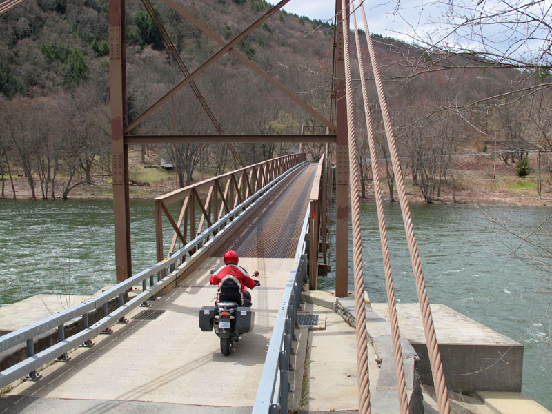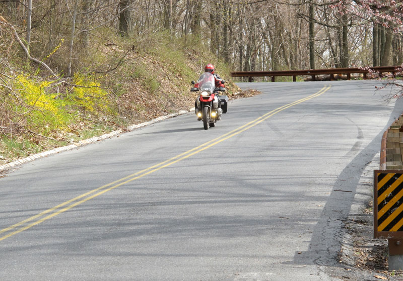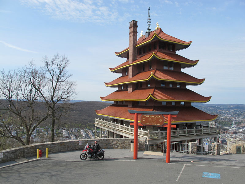 "Eastern" can refer to this pagoda, with its Chinese design, and in a different way, to its location - not in the Orient, but in the Eastern United States. It stands atop Mount Penn, overlooking Reading, Pennsylvania, where Michael and I stayed a night in late April. We were on a long backroad ride between the Adirondacks in upstate New York - where a few deep snowbanks lay in the woods, and flying snow filled the air - and Baltimore, Maryland, where flowers carpeted the woods, and spring filled the air.