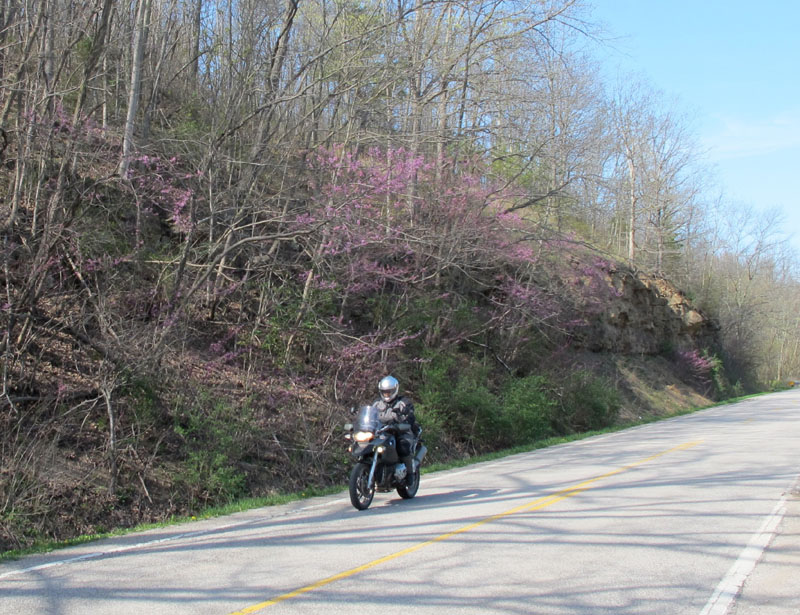 In the fifteen years I have been traveling on concert tours by motorcycle, the band has never toured in the East at that time of year, and it truly was a revelation to me. On April 4, our first ride led through the open woods of Tennessee, on the way from a show in Greensboro, North Carolina, to one in Nashville. While Michael and I followed the gentle curves and contours of two-lane roads, passing fields and lawns fresh with green, the woodlands remained a stark gray-brown network of bare trunks and branches. But I started to notice increasing numbers of small trees that glowed with vivid magenta blossoms, standing out all the more for being the only bright color, between the gray pavement, greening roadside, bare woods, and blue sky.