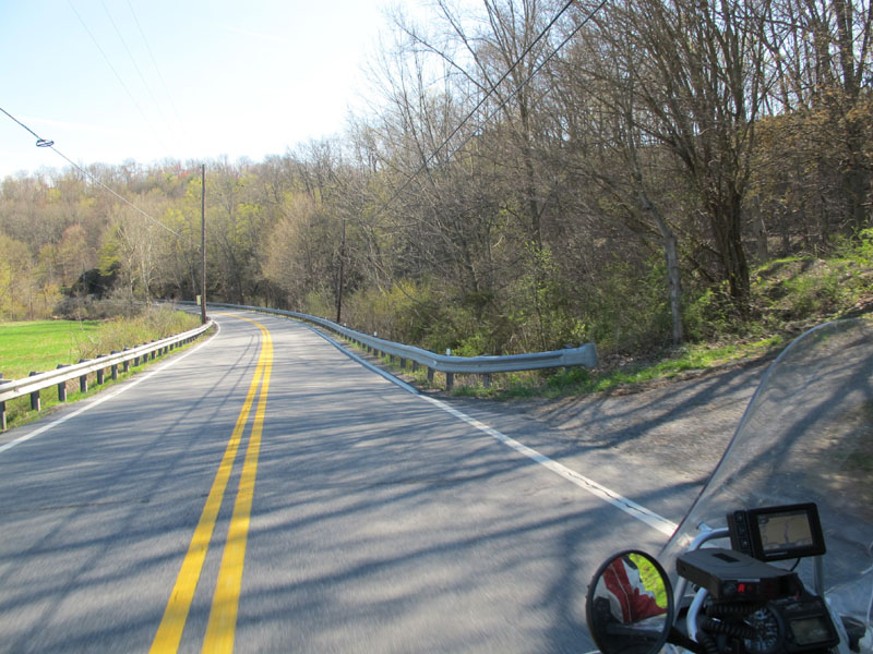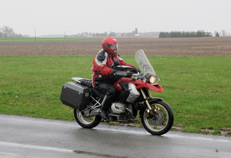 This was a particularly nasty April day, and as I rode along the backroads of Ohio and Indiana, I was trying to figure out how to capture a photograph of such riding conditions. I was hoping for one of those little bus-shelters for children you sometimes see in rural areas, figuring I could put Michael there, and have him photograph me riding by through the rain.