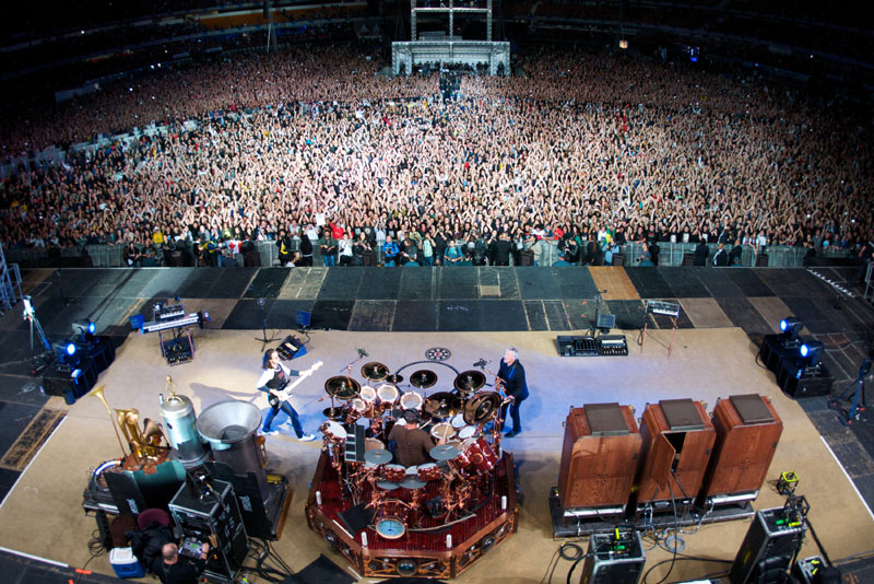 In the spirit of giving away the "secrets" behind some of the photographs I choose, I asked John ("Boom-Boom" - our pyro technician and photographer of daily events) how he captured this amazing image. He told me he had to scale the rigging behind us, then climb sideways along the truss above the video screen. Then he had to wait for the lighting to be right, and for the three of us to be facing each other. (The end of "The Spirit of Radio" is my guess.)