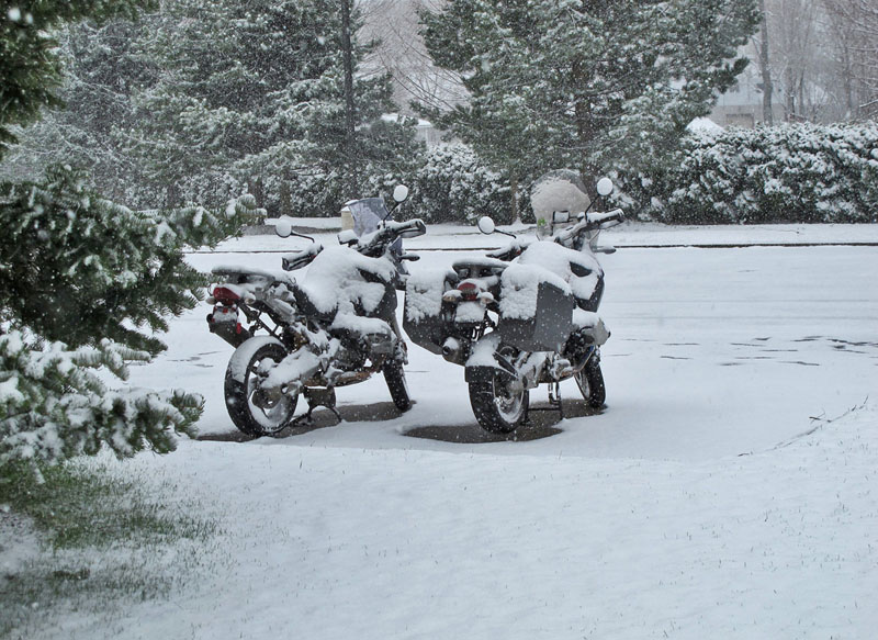 But we had one more weather extreme to face. On April 18, I awakened in a Best Western in Sarnia, Ontario, and what I saw through the open curtains was unbelievable - once again, I literally did not believe my eyes. I closed my eyes, rubbed them, opened them again, then got up and stepped closer to the window. Sure enough - about four inches of snow covered the ground, the trees, and our bikes.
